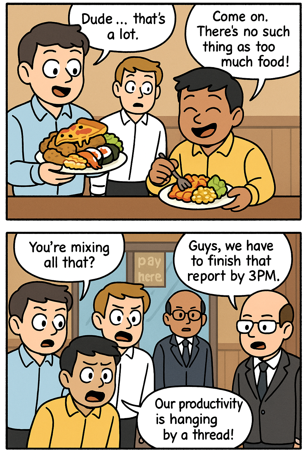 → “Hey, there’s no such thing as too much food.” - “Should I order dessert too?”