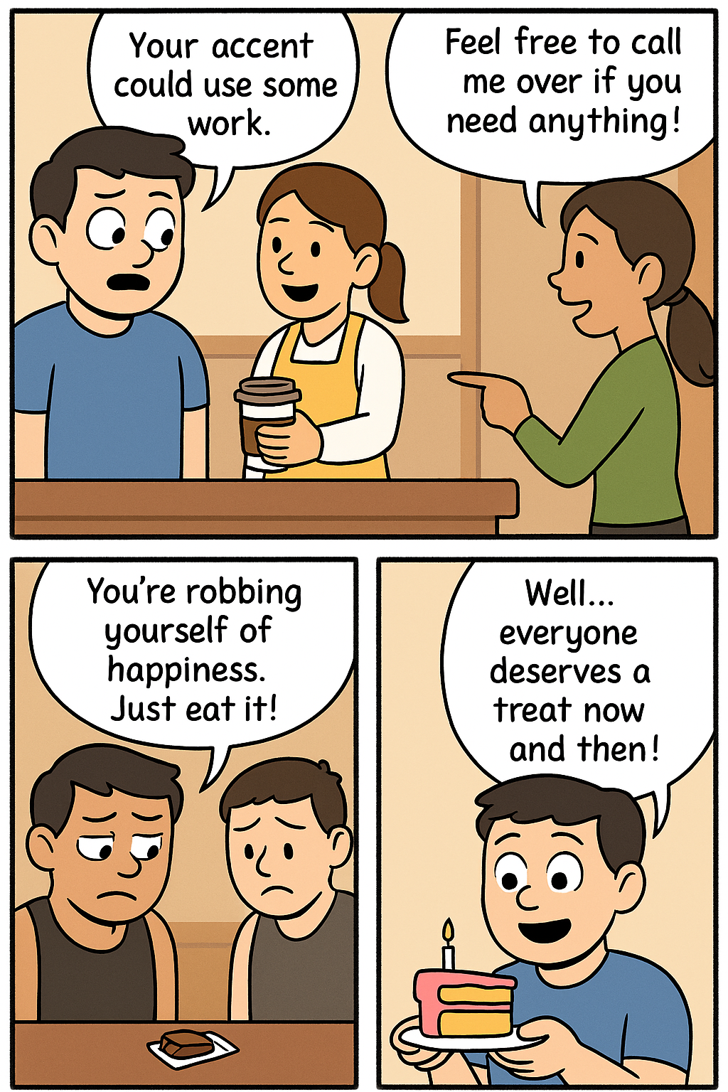 상황: 다이어트 중에도 디저트를 먹고 싶어할 때, 친구에게 힐링을 권할 때